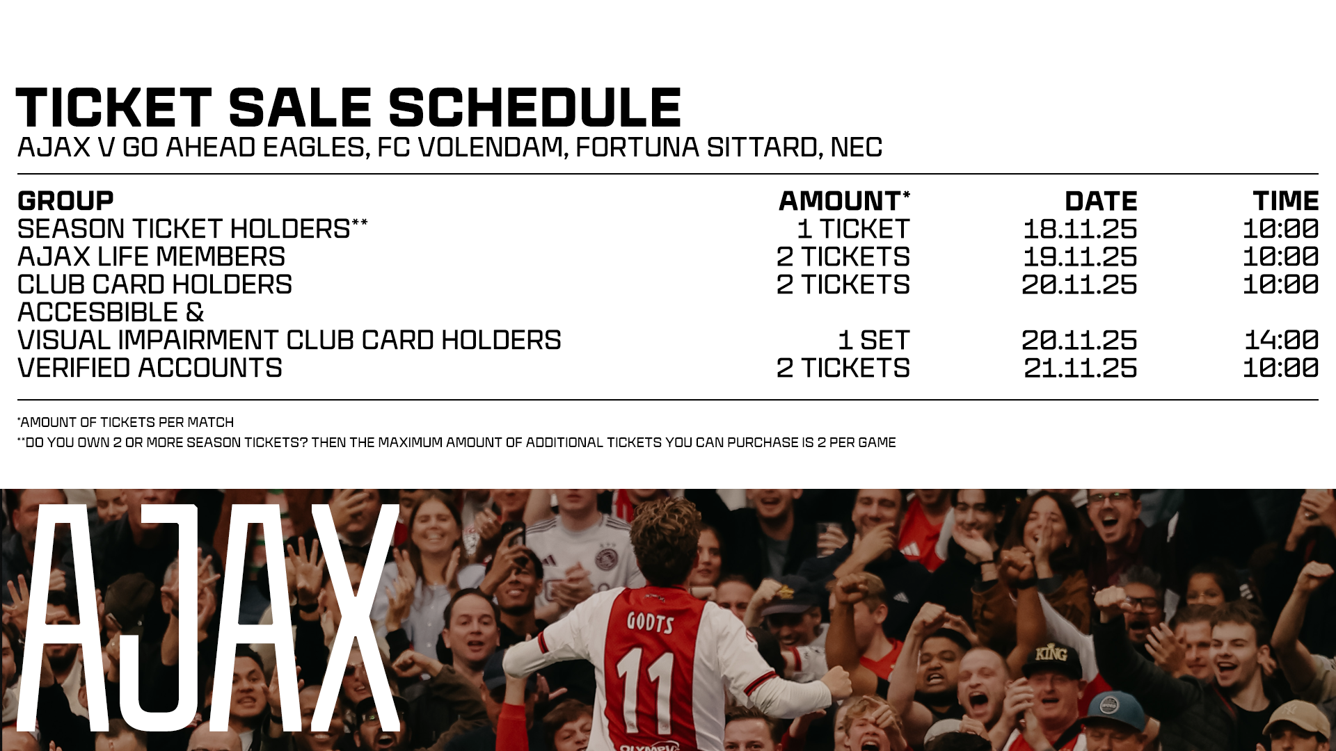 The matches against Go Ahead Eagles and FC Volendam have been scheduled, but the match dates may still change due to the cup competition. The final dates for these matches, as well as for Fortuna Sittard and NEC, will be confirmed at the end of December. Mobile tickets will appear in the Ajax app once the kick-off times have been finalized.